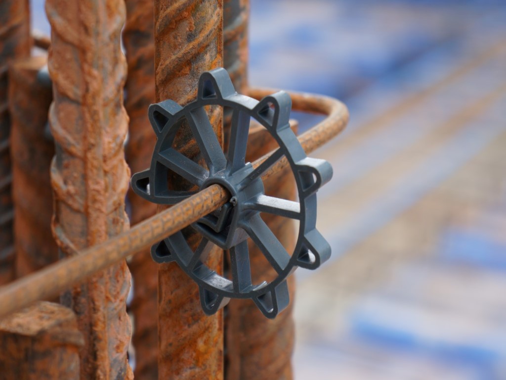 Espaçador circular universal. Com perfil construído de maneira a diminuir o contato do mesmo com a fôrma e o encaixe do ferro, dificultando a sua saída do aço. Seu encaixe exclusivo possui um sistema de mola e contramola permitindo um alojamento perfeito do ferro. Indicado para ferragem vertical na construção de paredes, colunas, lateral de vigas, postes, tubos e prémoldados de concreto.